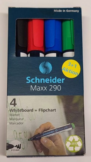 Schneider Maxx 290 Whiteboard- und Flipchart-Marker farbsortiert 2,0 – 3,0 mm, 4 St. Sie sind sowohl auf Papier als auch auf glatten Flächen einsetzbar, sodass Sie jederzeit ein hochwertiges Utensil zur Hand haben. Die geruchsarme Tinte ermöglicht eine angenehme Nutzung auch über einen längeren Zeitraum hinweg. Das Gehäuse besteht aus robustem Kunststoff, das Langlebigkeit und Stabilität garantiert. Falls Sie den Marker für einige Tage offen haben, trocknet er deshalb nicht ein.