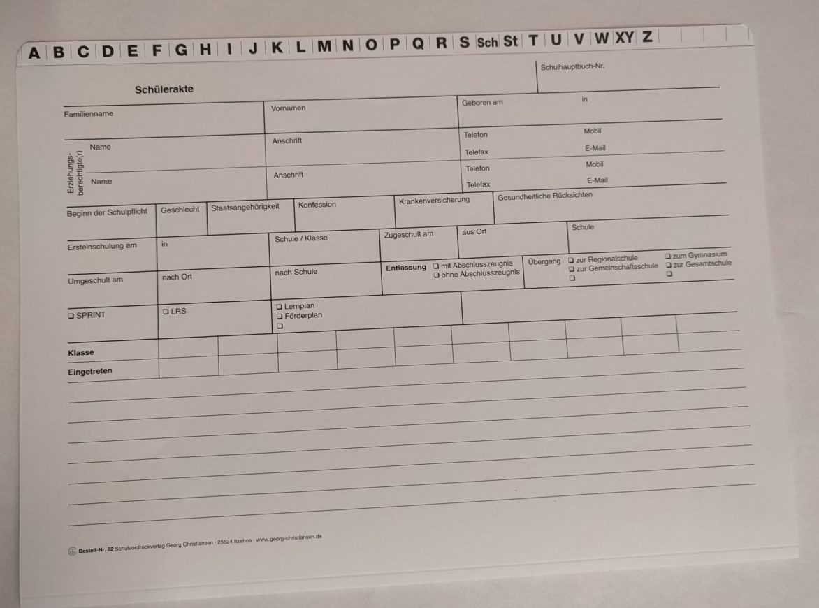 (Einstellmappe) mit alphabetischem Register (ohne Stanze unter den Buchstaben), vorderseitig als Personalkarteikarte bedruckt.