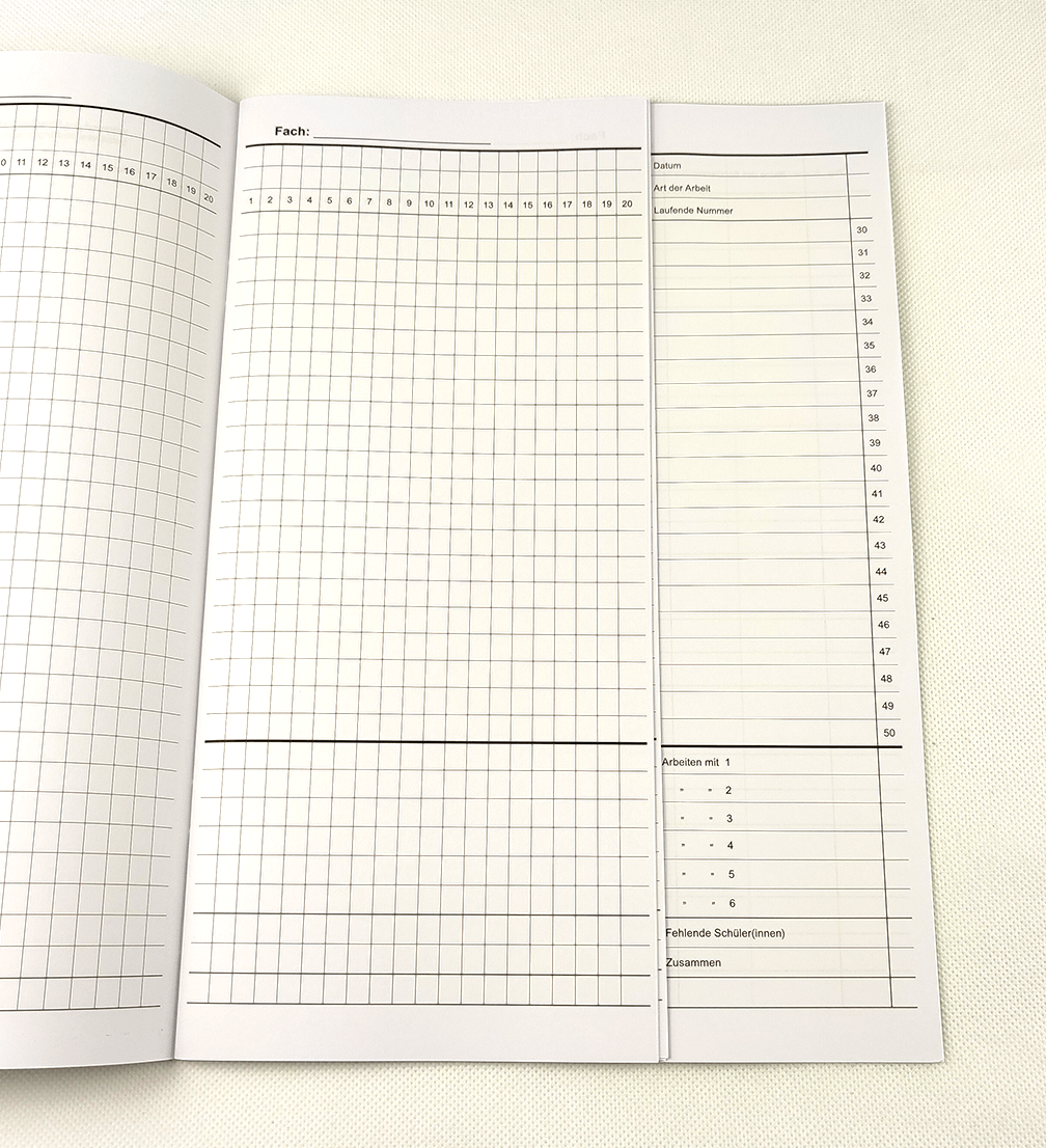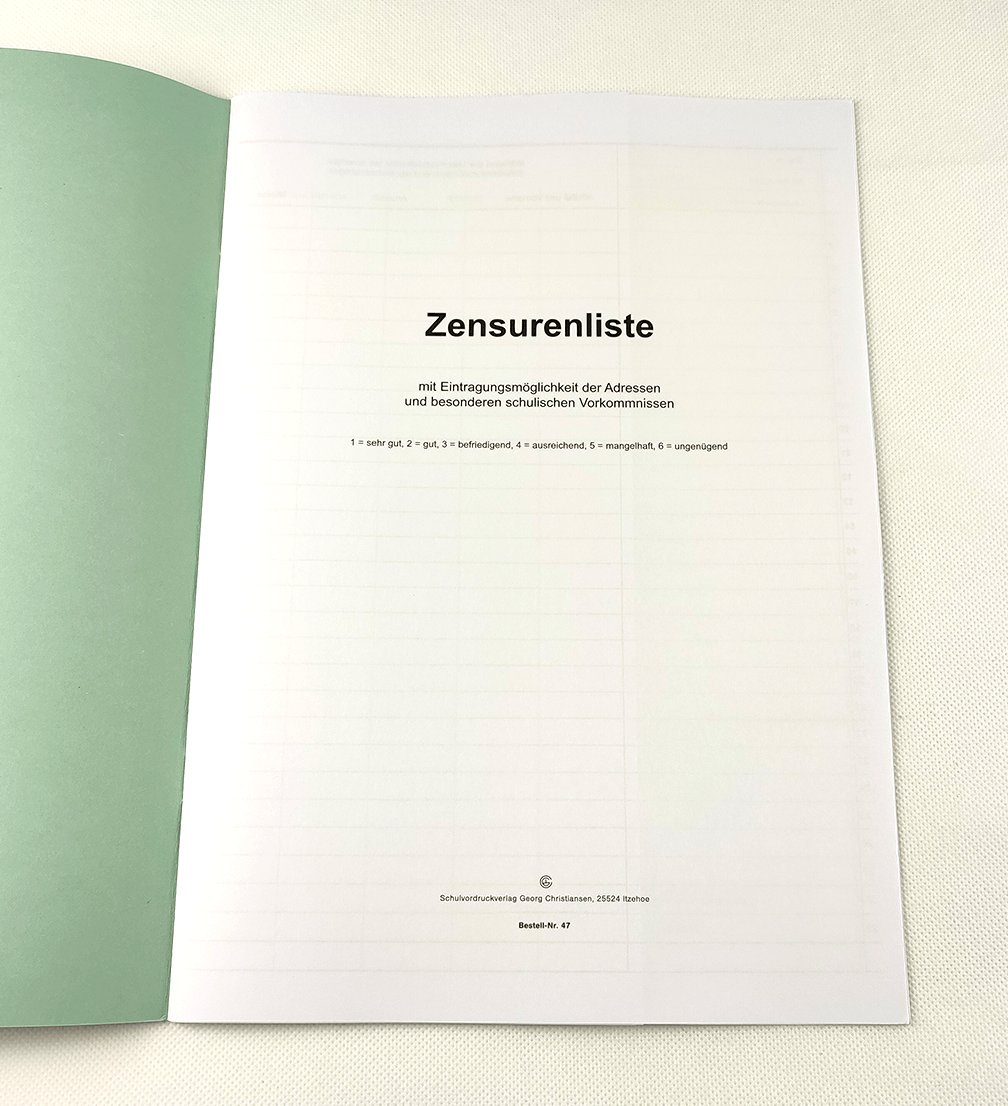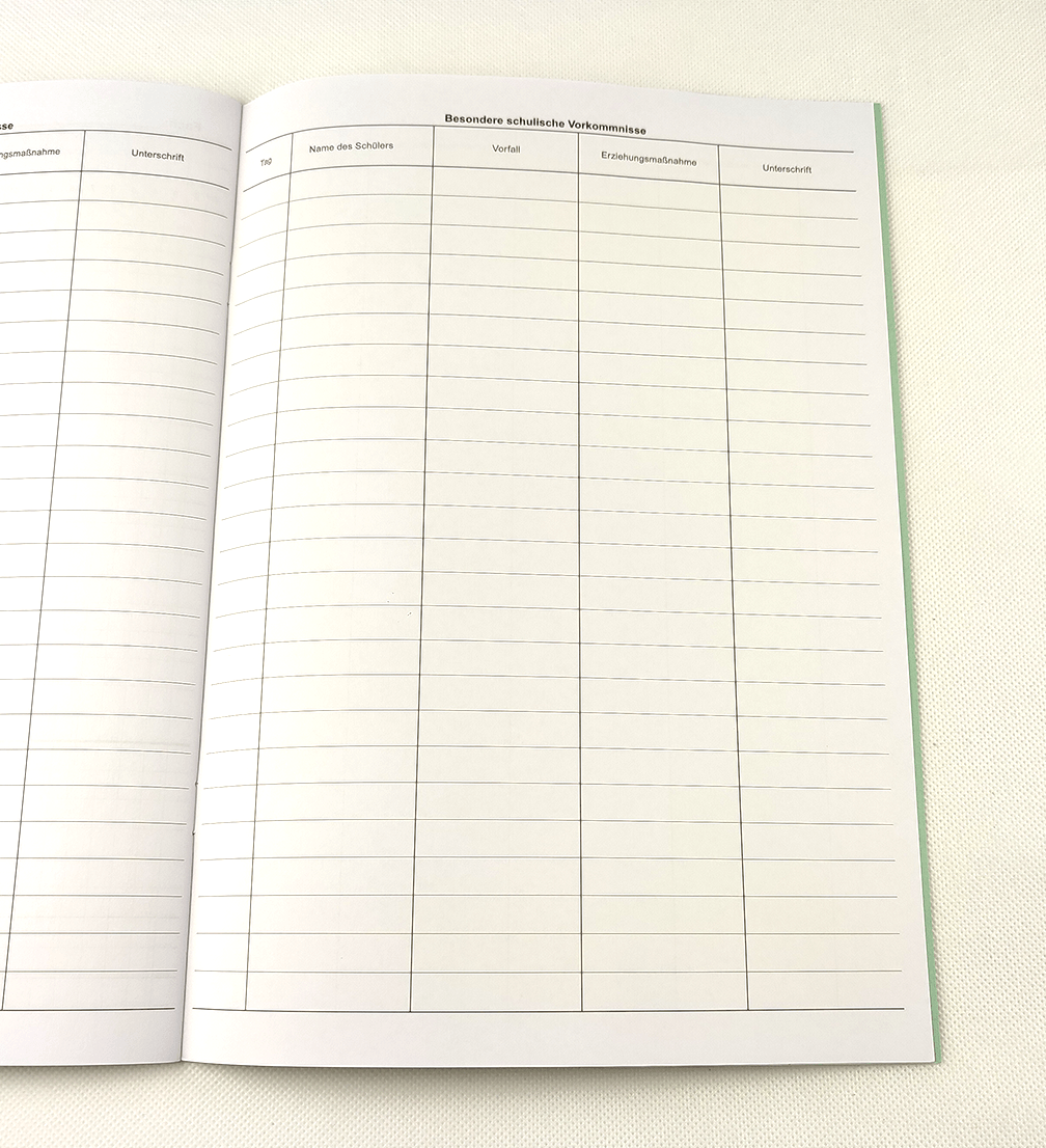 Mit Eintragungsmöglichkeit der Adressen und besonderen schulischen Vorkommnissen, kartoniert.